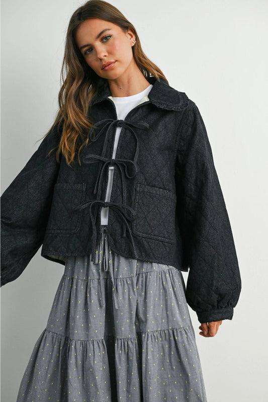 Black, Quilted Long Sleeve Tie-Front Jacket